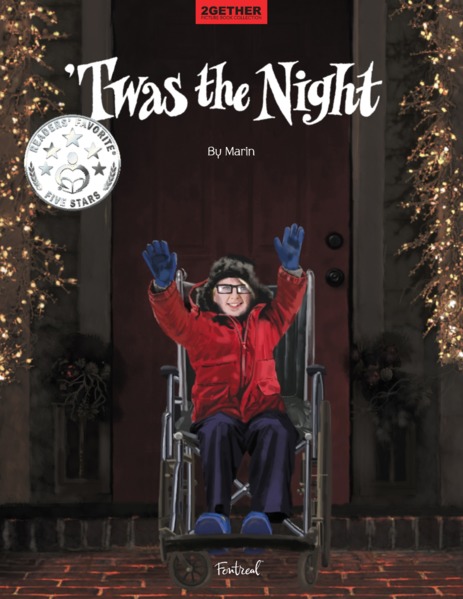 ‘Twas the Night is the only wordless children’s book in the 2GETHER picture book collection. The setting is dark, urban, and the streets are sprinkled with Christmas lights. A boy in a wheelchair finds an injured white dove on a sidewalk and brings it home. The entire book has no other people, cars or creatures. This reinforces the uniqueness of the two protagonists and adds a dream-like atmosphere to the publication. One of the illustrations shows a framed picture of Peter Pan’s shadow on the mantle, and readers realize the boy’s dream: he wants to fly with the dove. ‘Twas the Night is a real Christmas wonder that encourages readers to apply their own imagination, verbalize their own feelings, and interpret their own emotions while following the illustrations. The subliminal message? Dream big. ‘Twas the Night is a remarkable book in which dreams and reality mix, and imagination takes flight – just as the dove and the boy in the wheelchair do.