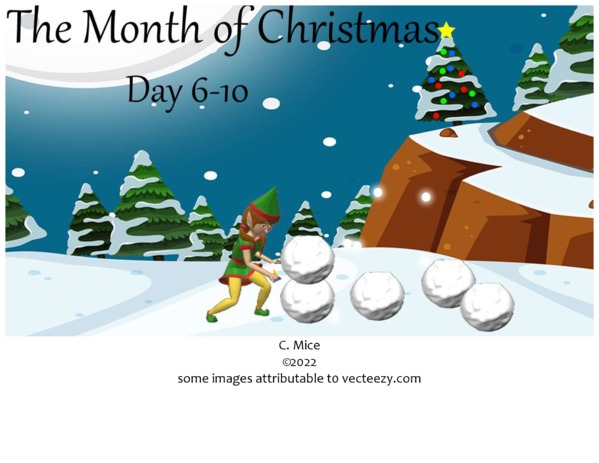 Days 6-10 of Christmas Month are full of games. There are board games, card games, word games, thinking games and various kinds of puzzles to solve. Learn about the games the elves invented and also about the ones people have made. Find out the elves' favorite Christmas stories and read the story of how Jack Frost became a pixie. Online you can play games the elves play during these five days of Christmas Month. Get the book for free at https://www.teacherspayteachers.com/Product/The-Month-of-Christmas-Days-6-10-8352903. See the video at https://www.youtube.com/watch?v=z70XIZkWKBI&list=PLwpHpKaaOuf_brBYcuyNtmKMAQrbLZso9